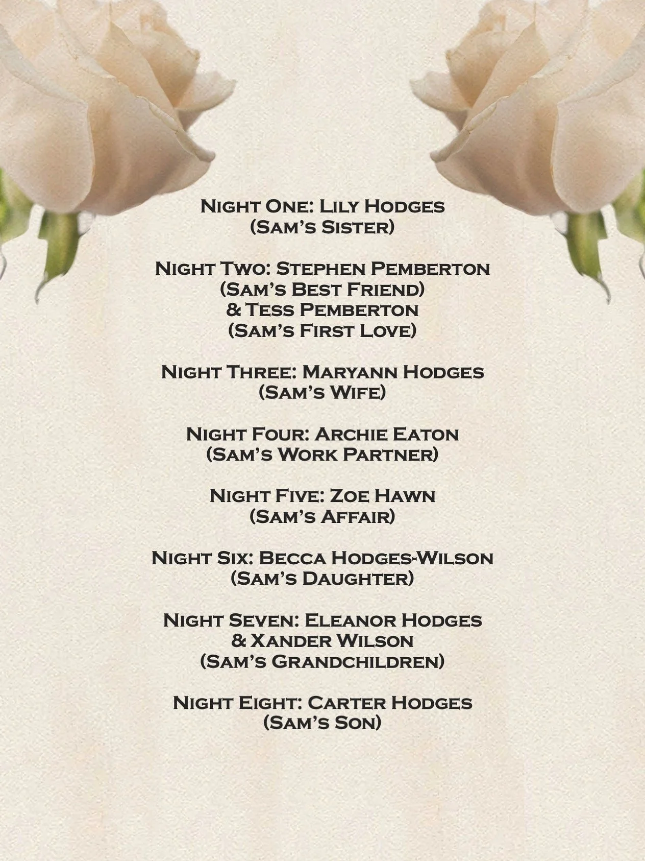 Welcome to Eight Eulogies For Samuel Hodges. While we wait for the service to begin, feel free to grab a drink and look around.